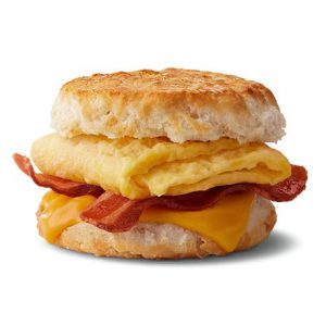 یک عدد تخم مرغ ، بیکن گریل شده ، یک ورق پنیر چدار ، نان گرد اسلایدری